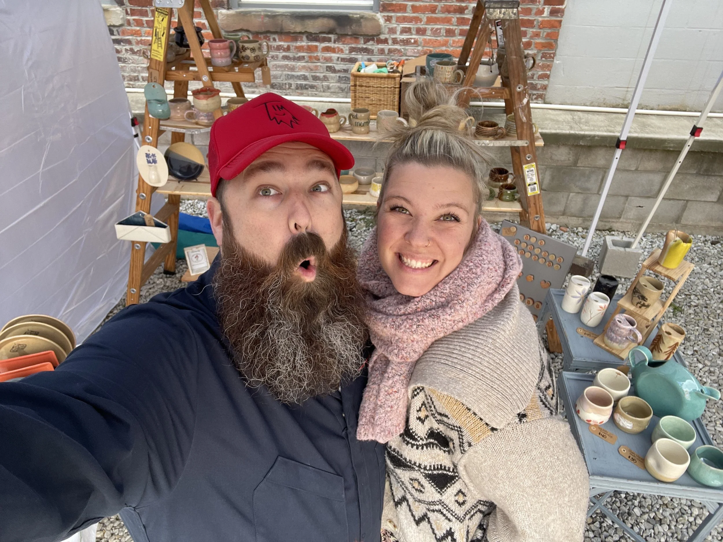 Tim’s the guy with the beard crafting bold, hand-built art, and I’m the bun-wearing coffee mug queen spinning your future favorite mug on the wheel.